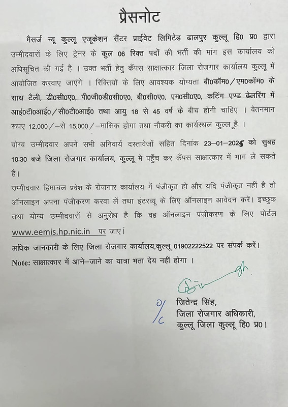 मैज़र्स न्यू कुल्लू एजुकेशन सेंटर प्राइवेट लिमिटेड कंपनी ने अपनी कंपनी के लिए 06 ट्रेनर पदों के लिए भर्ती की घोषणा की है। यह भर्ती ज़िला रोजगार कार्यालय कुल्लू में कैंपस इंटरव्यू से होगी। अगर आपको भी कुल्लू में नौकरी करनी है तो आपको कल इंटरव्यू के लिए जाना होगा।